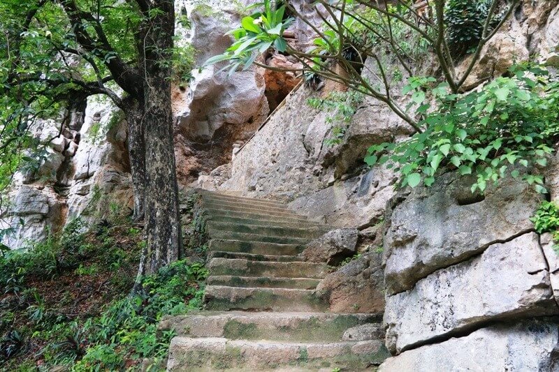 Per raggiungere la Pagoda Thuong, i visitatori devono salire quasi 40 gradini di pietra lungo il fianco della montagna. La Pagoda Thuong, nota anche come Pagoda Est, venera il Bodhisattva Avalokiteśvara. È la pagoda situata nella posizione più alta, vicino alla cima del monte Bich Dong. Dalla pagoda Thuong, guardando in lontananza, ci sono 5 montagne indipendenti che fiancheggiano il monte Bich Dong, che sembrano 5 petali di loto, chiamati Ngu Nhac Son, tra cui il monte Tam Sang, il monte Gia Dinh, il monte Con Lon, il monte Dau Cau e il monte Hang Da.