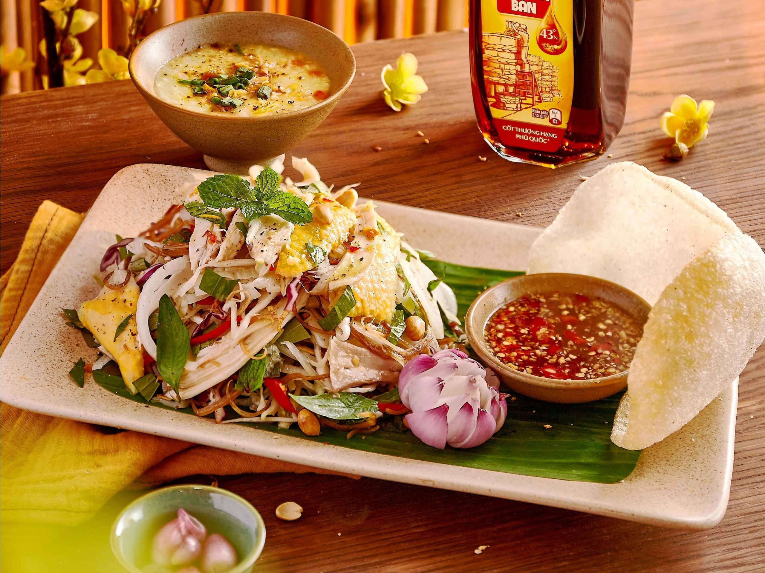 L’insalata di pollo è un piatto unico e delizioso, che unisce il nutriente pollo alla freschezza delle verdure crude. I diversi colori delle verdure crude, delle spezie e della salsa di pesce creano un delicato quadro culinario sulla tavola delle feste del Tet nel Sud.