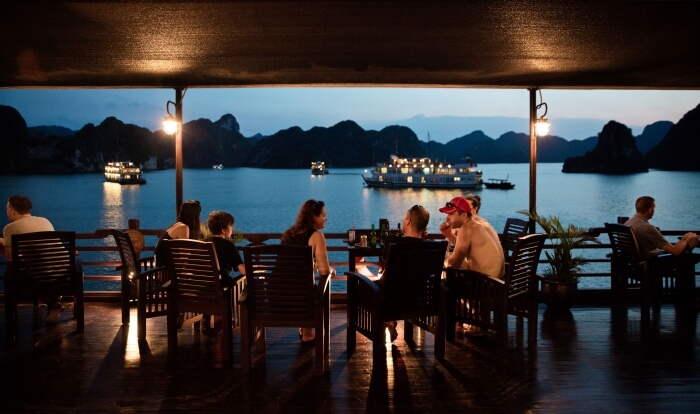 Tempo libero per chiacchiera e riposo, ammirando il tramonto sulla Baia di Halong.