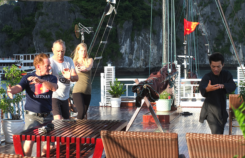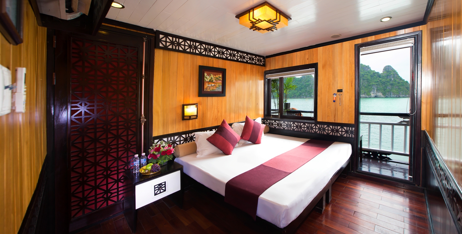 12:35 Check-in a bordo con Welcome Cocktail mentre il manager presenta il briefing sulla sicurezza e la barca naviga verso la baia di Bai Tu Long.