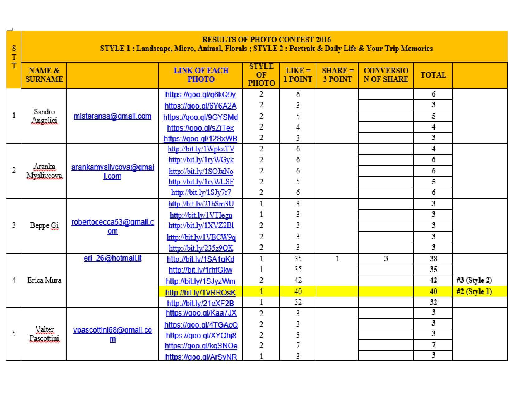 Nelle due categorie (Stile 1: Paesaggio, Micro, Animale, Fiori e Stile 2: Ritratto e Vita Quotidiana e Memorie dei vostri viaggi). Alcune foto dimostrano una professionalità molto elevata mentre numerose altre raccontano i ricordi belli e particolari sul loro viaggio, è difficile per noi quindi da dire quali sono le migliori. Fortunatamente non dobbiamo scegliere i vincitori ma è proprio voi. Come anticipato, i vincitori sono selezionati in base alla quantità di MI PIACE e CONDIVIDI su FACEBOOK.