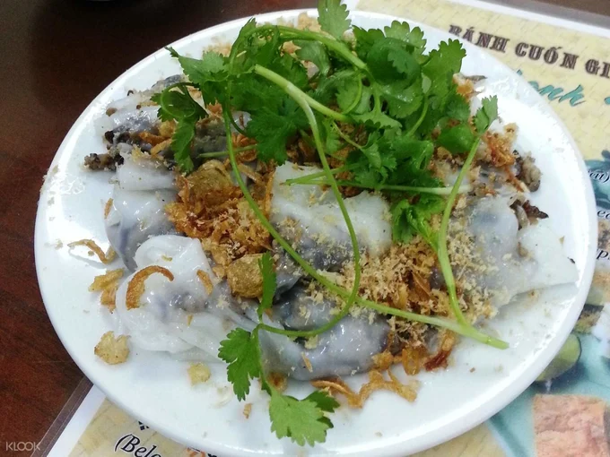 Tra i piatti più semplici ma indimenticabili di Ha Noi c’è il banh cuon, soprattutto quello di Thanh Tri. È una sfoglia sottilissima e morbida, arrotolata con un ripieno delicato di carne tritata e cipolla croccante.
