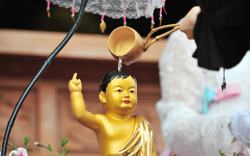 L’acqua svolge un ruolo fondamentale durante questa ricorrenza religiosa. Le immagini del Buddha vengono immerse nell’acqua per simboleggiare la pulizia spirituale. I fedeli possono partecipare attivamente riempiendo un mestolo di acqua e versandolo sul Buddha.