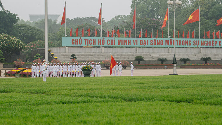 Alle 6 del mattino, un corteo di 37 soldati in uniforme bianca che portano la bandiera nazionale arriva da dietro il Mausoleo di Ho Chi Minh fino al pennone con la musica dell’inno nazionale. Dopo aver ricevuto il comando, la bandiera viene lentamente issata in alto sull’eco dell’inno nazionale vietnamita. Quando il testo dell’inno nazionale è terminato, la bandiera è stata sollevata in alto e ha sventolato davanti al mausoleo.