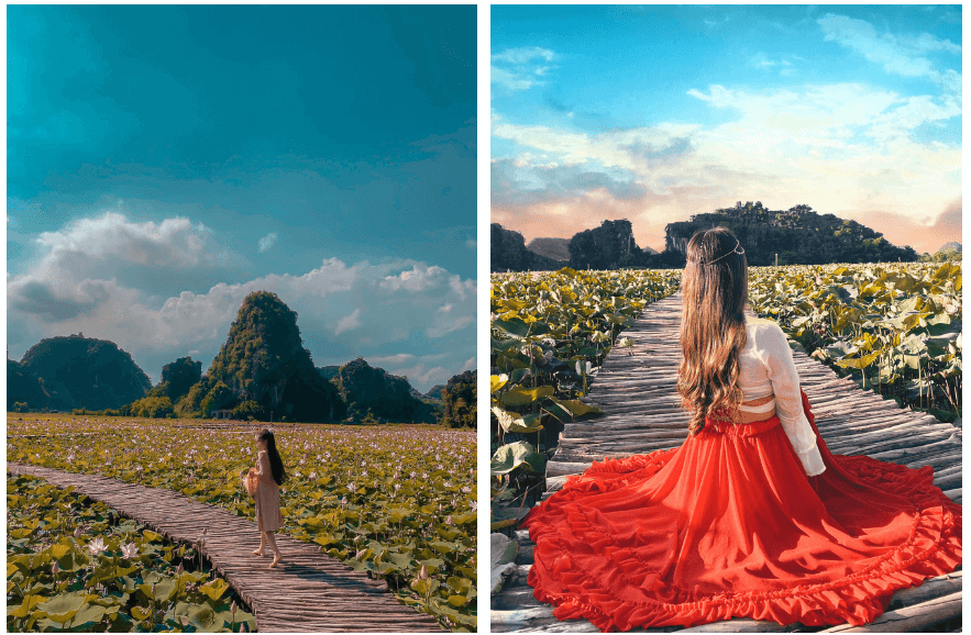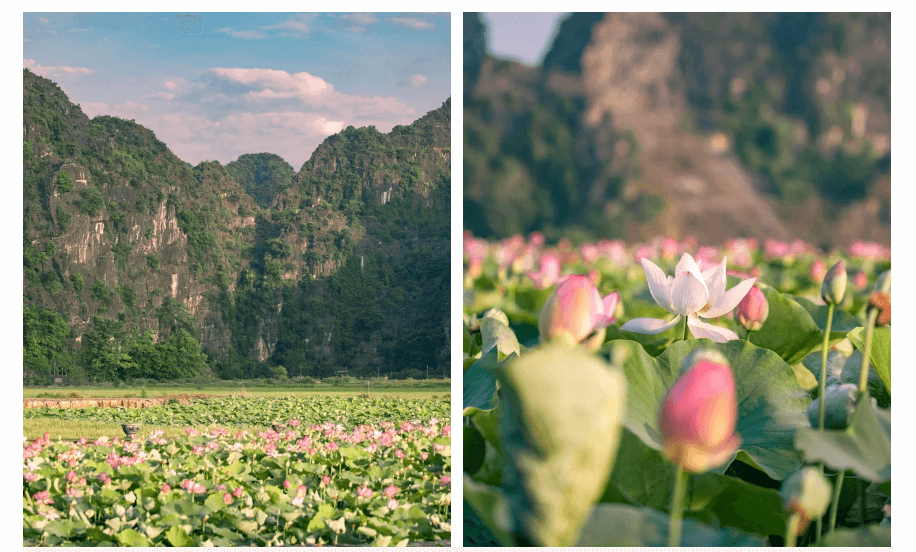 Di solito, da maggio a luglio, i fiori di loto sbocciano ovunque a Ninh Binh. Questo periodo valorizza più volte il già splendido scenario di Ninh Binh. Tra le maestose montagne, ci sono campi di loto verdi e rigogliosi, ornati da fiori di loto rosa. Basta il solo pensiero per far vibrare il cuore di bellezza!