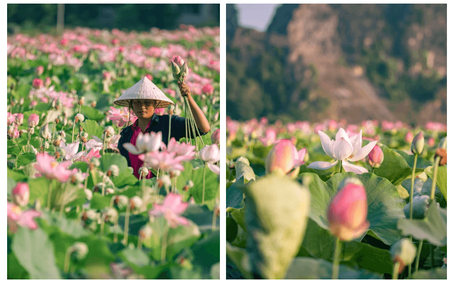 A differenza dei fiori di loto di Hanoi, i fiori di loto di Ninh Binh sono della varietà giapponese, con petali più piccoli e appuntiti, ma hanno comunque un delicato colore rosa ed emanano un profumo delicato. Un consiglio: visitateli al mattino presto o nel tardo pomeriggio per catturare le foto più belle ed evitate di andare a mezzogiorno, quando il sole è intenso. Al mattino presto, le gocce di rugiada si trovano ancora sulle foglie di loto, creando una scena pittoresca. Nel tardo pomeriggio, invece, il sole inizia a scendere e i petali del loto si chiudono gradualmente. In generale, ogni momento della giornata offre una cornice unica da catturare.