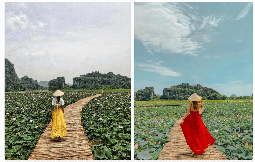 Approfittando del periodo in cui i fiori di loto sono nella loro stagione più bella, molte donne hanno colto l’occasione per visitarli e scattare qualche foto da postare su Facebook e Instagram. Tra gli stagni di loto di Ninh Binh, lo stagno di loto ai piedi della montagna Ngoc Long e della grotta Mua è il più grande e il più bello, con una superficie che raggiunge 1 ettaro.