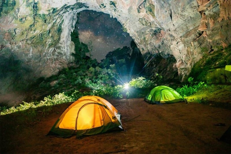 • Grotta Hang En: Hang En, una delle entrate di grotta più grandi del mondo, ti invita a un’esperienza di campeggio surreale all’interno della sua vasta camera, sotto un cielo stellato che contrasta con la caverna oscura.