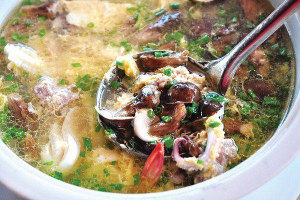 Infatti, il fungo di Tram, noto anche come fungo melaleuca o semplicemente funghi della foresta, è un ingrediente molto importante ed è usato in tanti piatti locali, tra cui la zuppa di funghi. Si tratta di un piatto davvero imperdibile grazie al sapore pieno, delicato e armonioso. Ottenuto da un po’ di funghi, erba cipollina, carne (di pollo, maiale, gamberi o seppie)… e spezie come sale, pepe, aglio, salsa di pesce. Tutti contribuiscono a dare alla zuppa un aroma attraente nonché irresistibile che si può sentire anche da lontano.