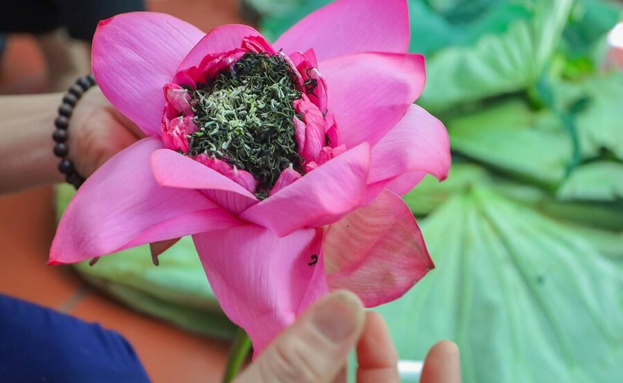 - Raccolta del loto: La mattina presto è il momento migliore per raccogliere il loto per produrre il tè di loto vietnamita. Prima viene raccolto, più i fiori sono aromatici. Gli artisti si recano spesso allo stagno di loto dalle 4 alle 6 del mattino, quando i boccioli hanno appena aperto i loro petali ricoperti di gocce di rugiada cristalline. Per ottenere 1 kg di prodotto, devono raccogliere circa 1.300-1.500 fiori. I fiori vengono poi separati manualmente dal polline per prepararli alla lavorazione.