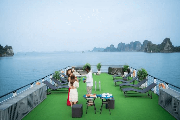 – Dopo di che, tornerete in crociera e sarete pronti per il nostro Sunset Party. Tè vietnamita, frutta fresca e snack saranno serviti mentre vi rilassate sul ponte o nella vasca idromassaggio.