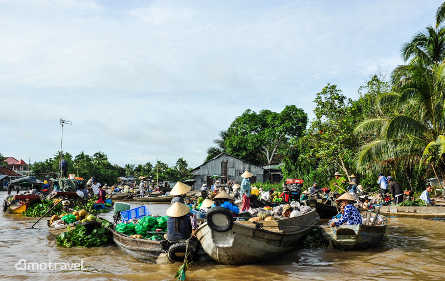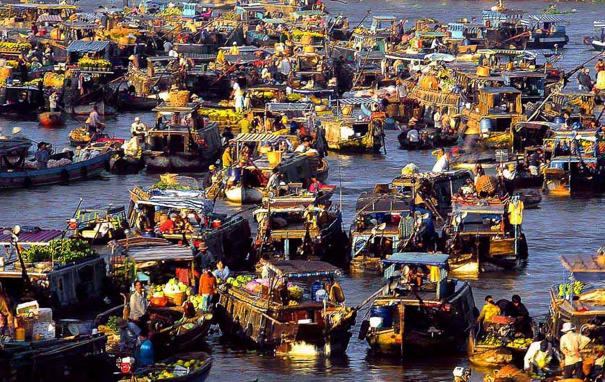 Trasferimento al molo per una gita in barca per visitare il mercato galleggiante di Cai Rang – il più grande e vivace del delta del Mekong. Le moltitudini di colori e odori riempiono l’aria creando un atmosfera frizzante dove centinaia di sampan pieni di merci come riso, frutta e prodotti artigianali che i commercianti portano al mercato alle prime luci dell’alba per vendere.