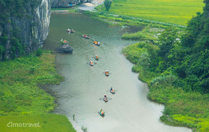 La provincia di Ninh Binh si trova a circa 100km dalla capitale, immersa in un paesaggio mozzafiato, tra fiumi e formazioni calcaree. La prima destinazione che va visitata è senza dubbio Tam Coc dove farete una passeggiata in una tradizionale imbarcazione sul fiume che lambisce le colline carsiche e le risaie. Questo posto, la cui bellezza per alcuni supera quella della baia di Halong, recentemente è diventato celebre anche con il nome ” Halong terrestre”. Solo il canto degli uccelli distoglie l’attenzione da questa scena da “altro mondo”. Nei pressi Tam Coc è possibile concedersi una visita anche alla pagoda Bich Dong – una serie di templi rupestri al XV secolo situati su un rilievo. L’escursione dura circa un paio d’ore, percorrerete i 2 km del fiume lungo i quali si trovano tre grotte scavate dall’acqua.