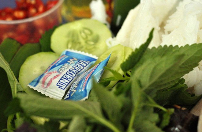 Per gustare questo piatto buono, i venditori aggiungono in una ciotola di pasta di qualche goccia di limone fresco, pepe, un po ‘di zucchero e un po’ di olio nella stessa padella che usano per friggere il tofu. Poi ci combiniamo. Questo è un modo in cui essi sono meno forte odore. Le spezie ricetta mescolati in ogni ciotola è probabilmente un segreto da conservare per ogni commerciante. Infine, immergete un pezzo di tofu, un pezzo di spaghetti di riso e una foglia di basilico nella pasta di sentire una combinazione perfetta.