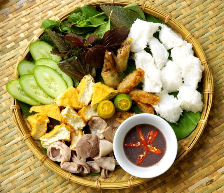 Quando si parla per cibo per strada del Vietnam, non possiamo dimenticare un piatto gustoso come il “Bun Dau Mam Tom” – tagliatelle bianche con pezzi di tofu fritto. Gli ingredienti sono semplici: pasta di riso (“bún”) e tofu fritto (“đậu”) che si mangia con una pasta di gamberetti (“mắm tôm”-  il fermento di gamberetti ).