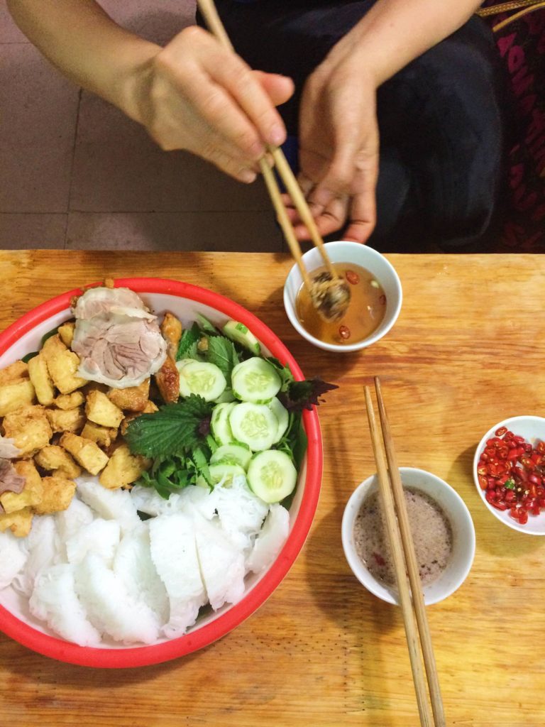 Quando si parla per cibo per strada del Vietnam, non possiamo dimenticare un piatto gustoso come il “Bun Dau Mam Tom” – tagliatelle bianche con pezzi di tofu fritto. Gli ingredienti sono semplici: pasta di riso (“bún”) e tofu fritto (“đậu”) che si mangia con una pasta di gamberetti (“mắm tôm”-  il fermento di gamberetti ).